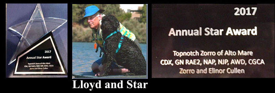 Every year at the PWDCNCs annual meeting, we announce the Lloyd DAugusta Star Award recipients. This distinguished performance award is presented as recognition of the versatility and working drive of Portuguese Water Dogs. The award was named in honor of our longtime club member, Lloyd DAugusta and his beloved companion, Star. Sadly, we lost Lloyd in October 2010. Prior to his passing, Lloyd expressed his interest in seeing our club develop an award solely for PWDCNC members and their dogs. There are two awards recognizing Lifetime and Annual achievement. The PWDCNC commissioned a perpetual trophy in addition to the annually presented trophies to one dog in each category.